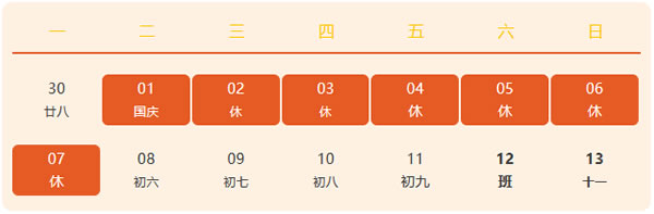 10月1號(hào)至10月7號(hào),共計(jì)7天,9月29號(hào)(星期天),10月12號(hào)(星期六)正常上班。